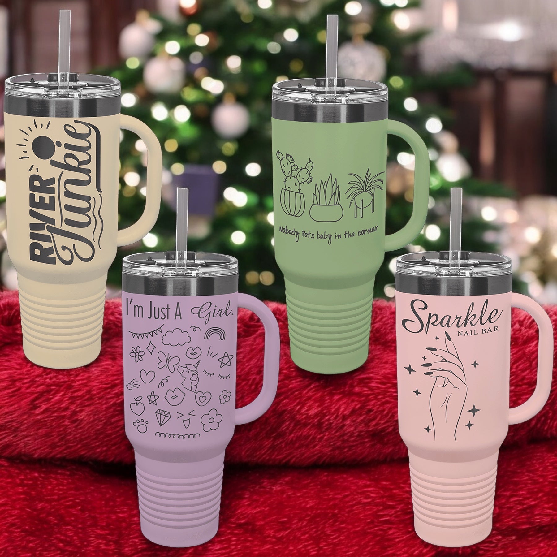 Two fan-favorite sizes: • 20oz Tumbler • 40oz Travel Mug with Handle